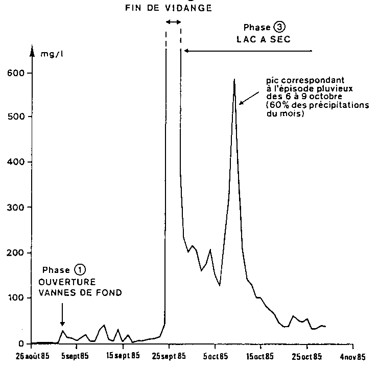 Dans le cadre d’une convention tripartite EDF - Ministère de l’Industrie - Ministère de l’Environnement signée le 1er juillet 1982, la Direction des Etudes et Recherches d’EDF a lancé un programme d’études pour mieux connaître l’impact des vidanges des réservoirs sur les écosystèmes aquatiques. Ces études ont permis d’identifier trois phases possibles de fortes concentrations de matières en suspension dans la rivière, à l’aval du lac vidangé (les teneurs en matières en suspension ont été mesurées suivant la norme AFNOR T90-105 : filtration sur filtre milipore AP-20 puis dosage par pesée après séchage à 105 °C) :