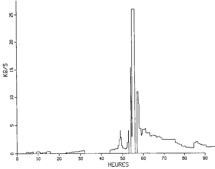 Figure 2: flux de M.E.S. (kg/s) à la sortie immédiate du barrage de Gherlédan en fin de vidange (origine des temps le 23/09/85 à 5 heures TU; d'après Gosse, 1991).
