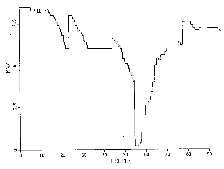 Figure 3: Evolution de la concentration en oxygène dissous (mg/l) à la sortie immédiate du barrage de Guerlédan en fin de vidange, pendant 90 heures. Origine du temps (t = o) le 23 septembre 1985 à 5 heures TU (GOSSE, 1991) :