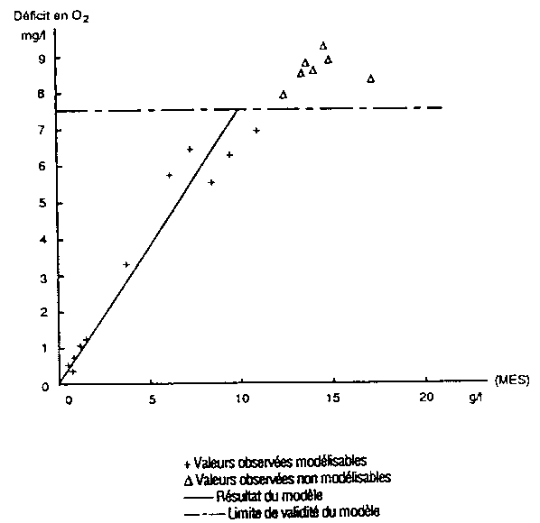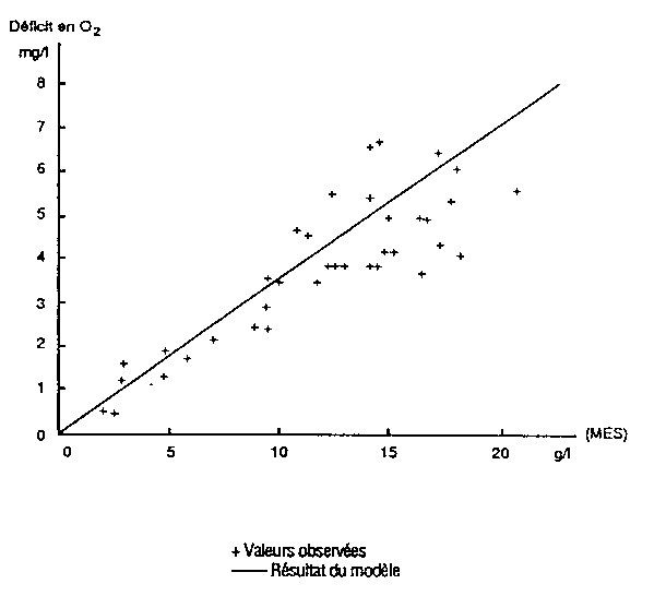 Une étude de ROFES et coll. (1991), montre également la relation entre les MES et le taux d’oxygène dissous, mais cette fois exprimé comme un déficit d’oxygène. Lors de cette étude les mesures sont effectuées au niveau de deux stations (1 et 2) correspondant à des temps de transit respectifs de 40 et 110 minutes depuis le barrage. A l’issue de la période de mesures, les graphiques réalisés (ci-dessous) montrent que le déficit en oxygène dissous est plus important après un transit de 110 minutes qu’après un transit de 40 minutes, tout en restant proportionnel à la concentration de MES.