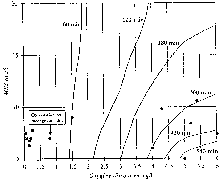 Figure 6: isochrones pour un seuil de mortalité de 10 % des truites face au couple M.E.S. et O2 (d'après Poirel et al., 1993).