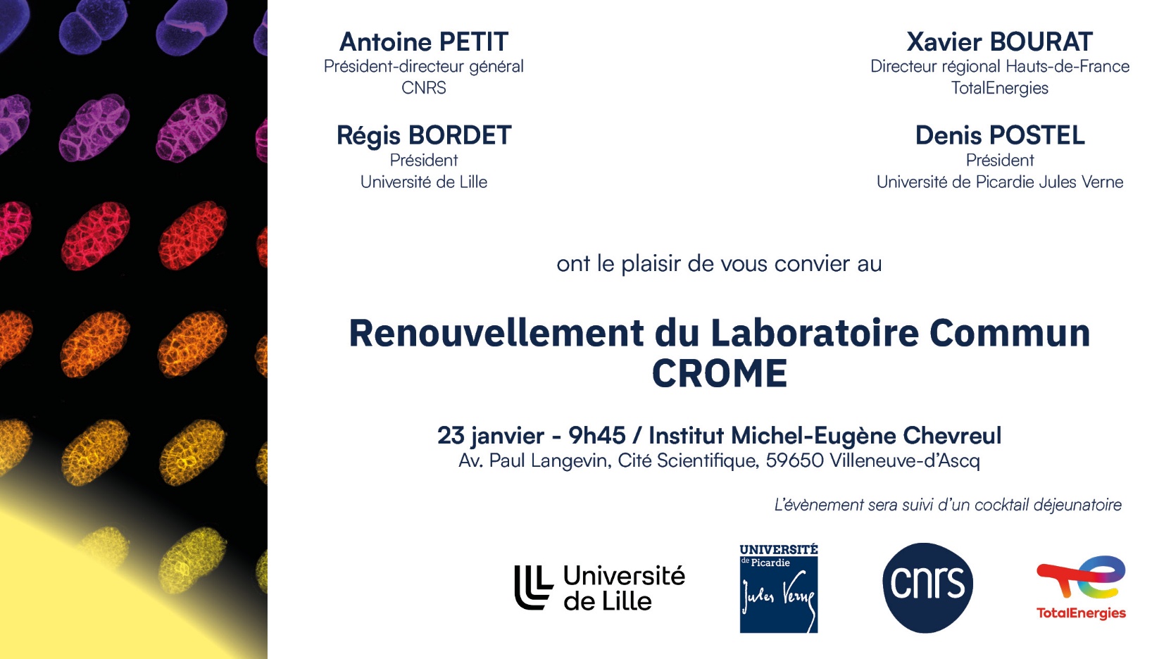 La cérémonie officielle marquant le renouvellement du laboratoire commun CROME (Centre de Recherche Operando pour les Matériaux et l'Énergie) se déroulera le 23 janvier 2026 à l'Institut Michel-Eugène Chevreul de Villeneuve d'Ascq.