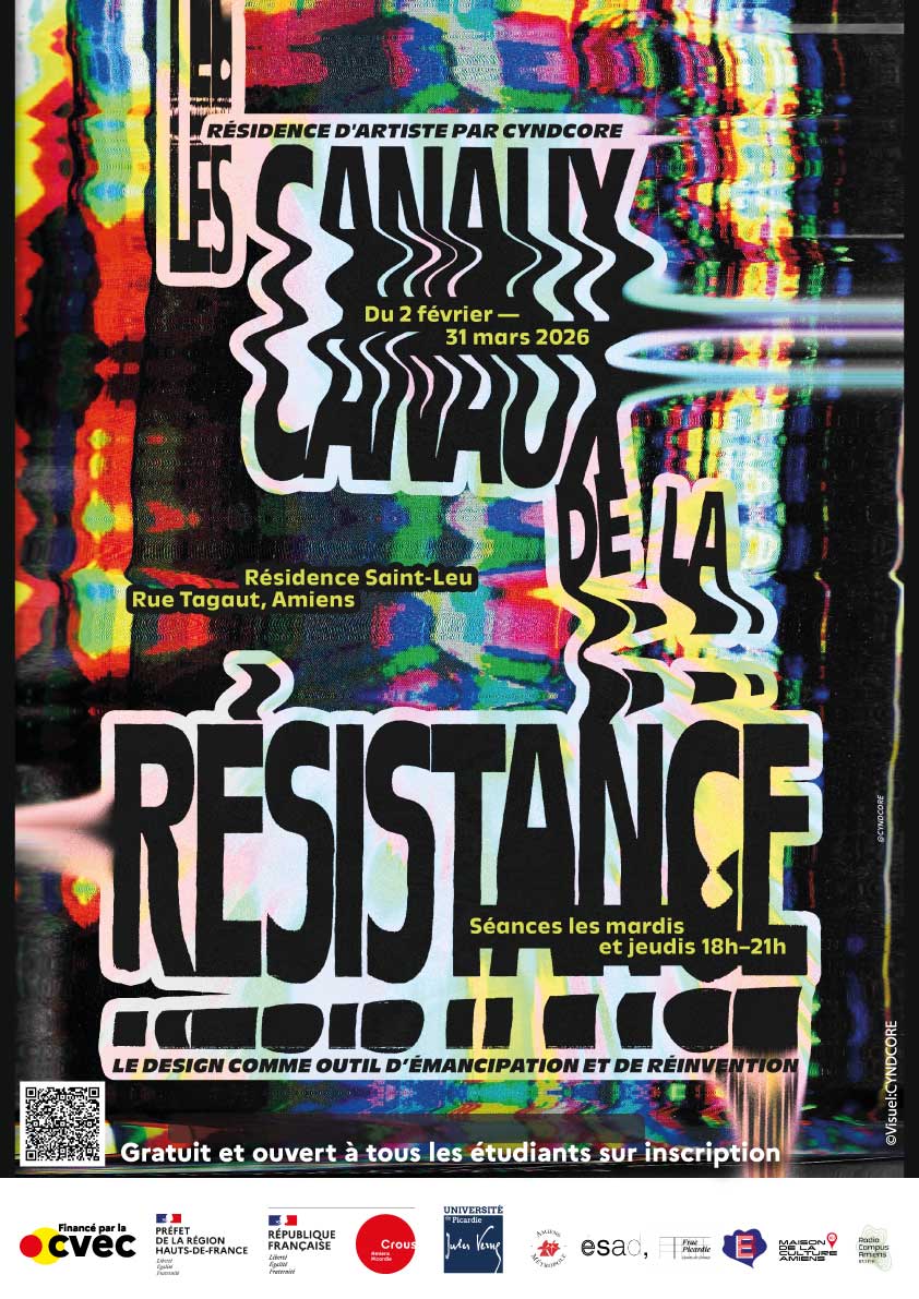 L'artiste et designer graphique Cyndcore, spécialisée dans le collage, la typographie et la récupération d'images et de matériaux, s'installe au CROUS Amiens Picardie en partenariat avec l'UPJV de février à mars 2026.
