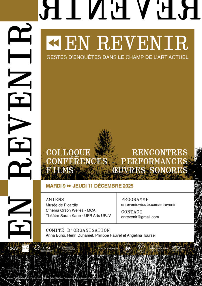 En revenir. Comment revenir de, revenir à l’enquête ? Cette manifestation propose d’examiner les gestes d’enquêtes dans l’art, avec le caractère interdisciplinaire que cela revêt, pour en définir les spécificités et leurs modalités dans la création. Nous l’envisageons comme un laboratoire de formes et un espace d’échanges mouvants et plastiques. Artistes, artistes-chercheur·se·s et spécialistes venu·e·s de diverses disciplines seront réuni·e·s pour la présentation d’œuvres, des communications et des conférences-performances.