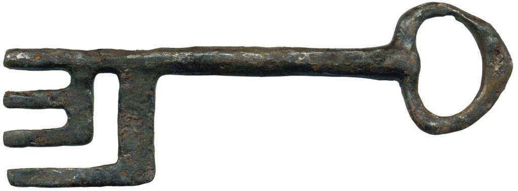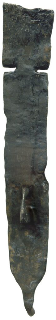 Extrémité d’une penture de coffre en forme de fleur de lys. Cet élément provient de remblai (US 1254), issu du curage du fossé défensif et contenant un grand nombre d’artefact.